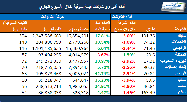 يوضح أداء أكبر عشر شركات من حيث القيمة السوقية خلال الأسبوع: