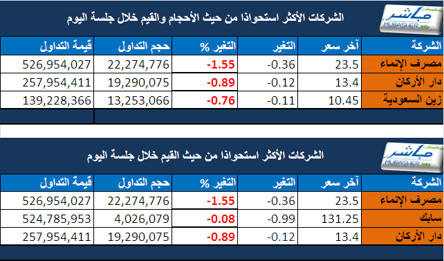 والقيم اليوم "مصرف الإنماء" بـ 22.27 مليون سهم و 526.95 مليون ريال، تلاه