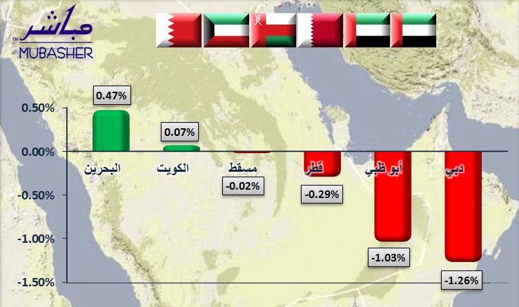 بنهاية جلسة اليوم بصدارة مؤشر سوق دبي بنسبة 1.26%، تلاه مؤشر سوق أبو ظبي