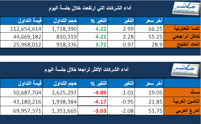 الكثر ارتفاعا أكسا التعاونية للتأمين بـ 4.22%، وتكافل الراجحي بـ 4.21%،